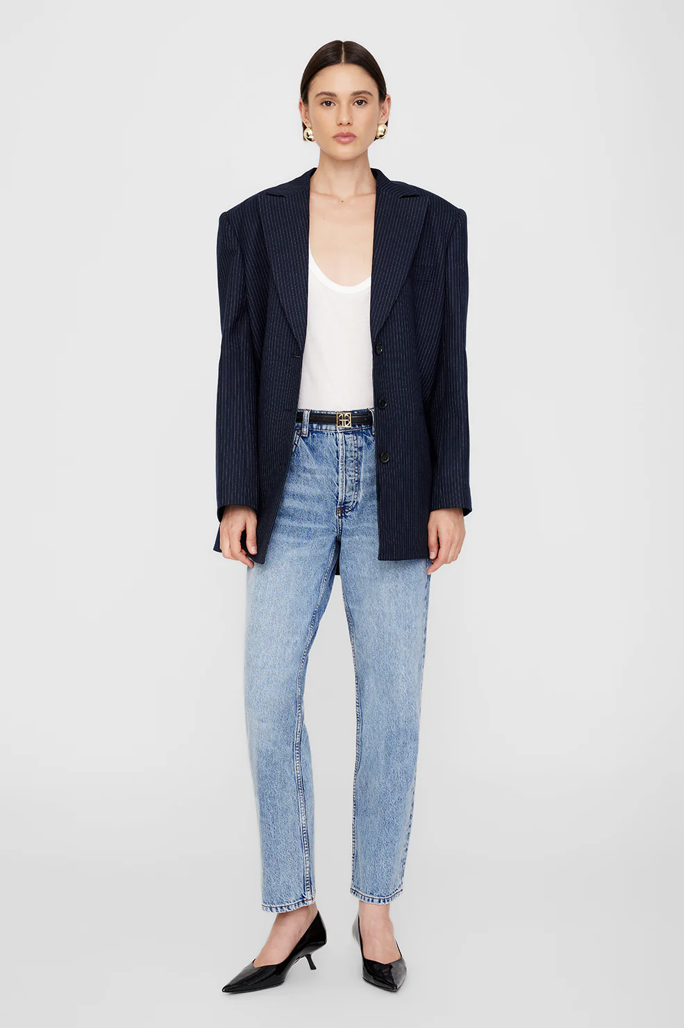 An elegant dress pump made from black patent leather with a high-shine finish. The Hilda Pumps' sleek construction features a sharp pointed toe, angular kitten heel, high-shine outsole, and cushioned insole. Accented with gold-tone ANINE BING hardware at each heel.